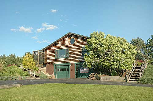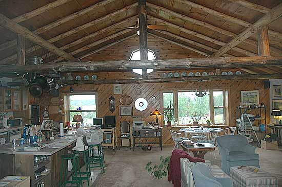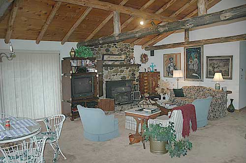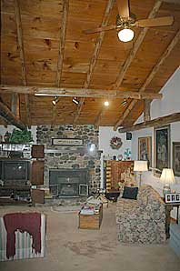 Great Room with Beamed Cathedral Ceiling, Stone Hearth &